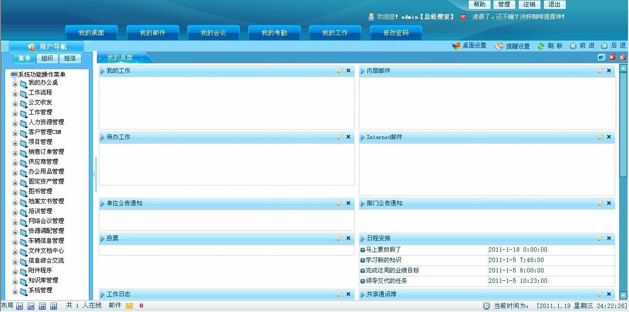 - 集成公告、内部邮件、内部短信、文件柜、聊天室、论坛等模块,提供企业内部信息交流的多种方式
