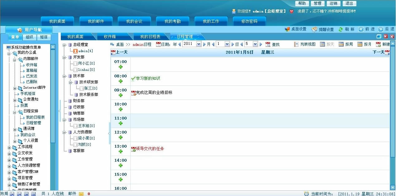 - 集成考勤管理、员工日程安排查询、员工工作日志查询、会议管理、工作计划等模块,提供企业管理者全新的管理工具