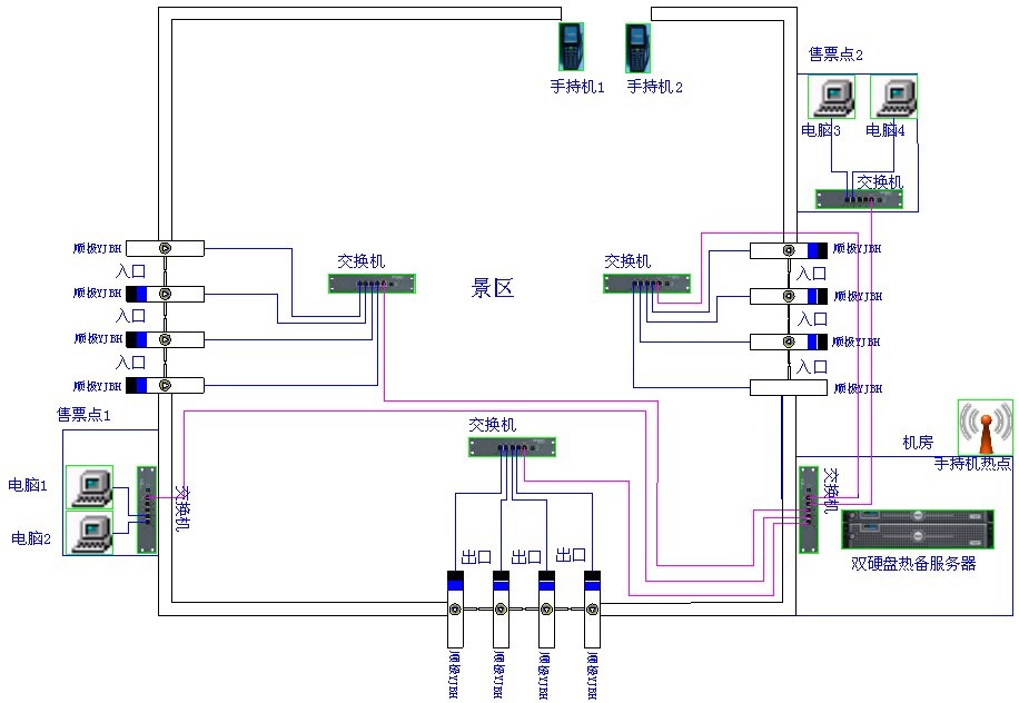 3) 系统在网络上分为:检票机端、服务器端、数据库端、售票点端、无线手持端,其中服务器端采用硬件双盘热备服务器,能保证数据库的安全