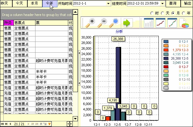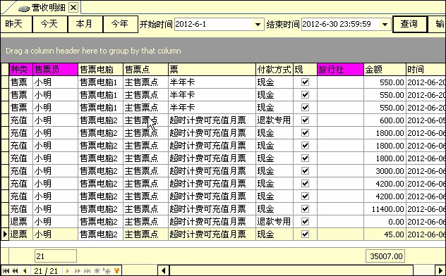 2) 售票员可以随时查询自己的售票状态,高权限的角色能查询所有营业状况,支持各种筛选情况,如按售票点查询、按售票员查询、按时间段查询等等,查询的报表可以输出成表格、网页等常用格式